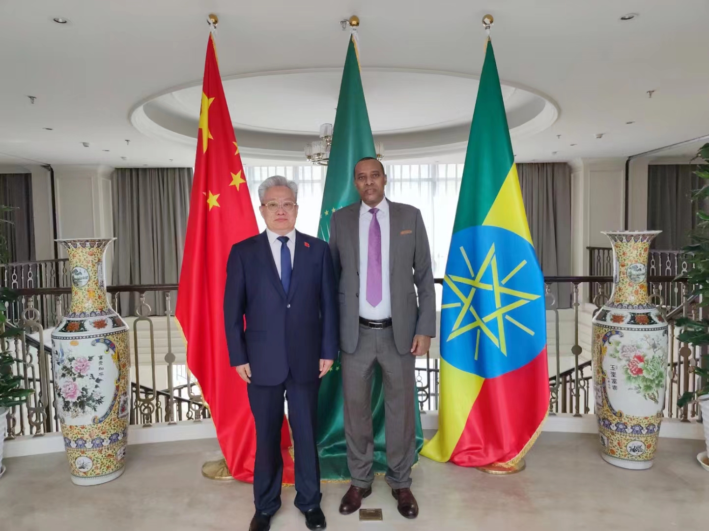 4月12日,中非经济贸易工作委员会在埃塞俄比亚驻华大使馆进行访前拜会。中非经济贸易工作委员会主任黄兆锦、外联主任杨佩超等人与埃塞俄比亚驻华副大使德瓦诺(Dawano Kedir)、埃塞俄比亚驻华商务参赞索罗门(Solomon Mekonnen Lelamo)共同出席会见。