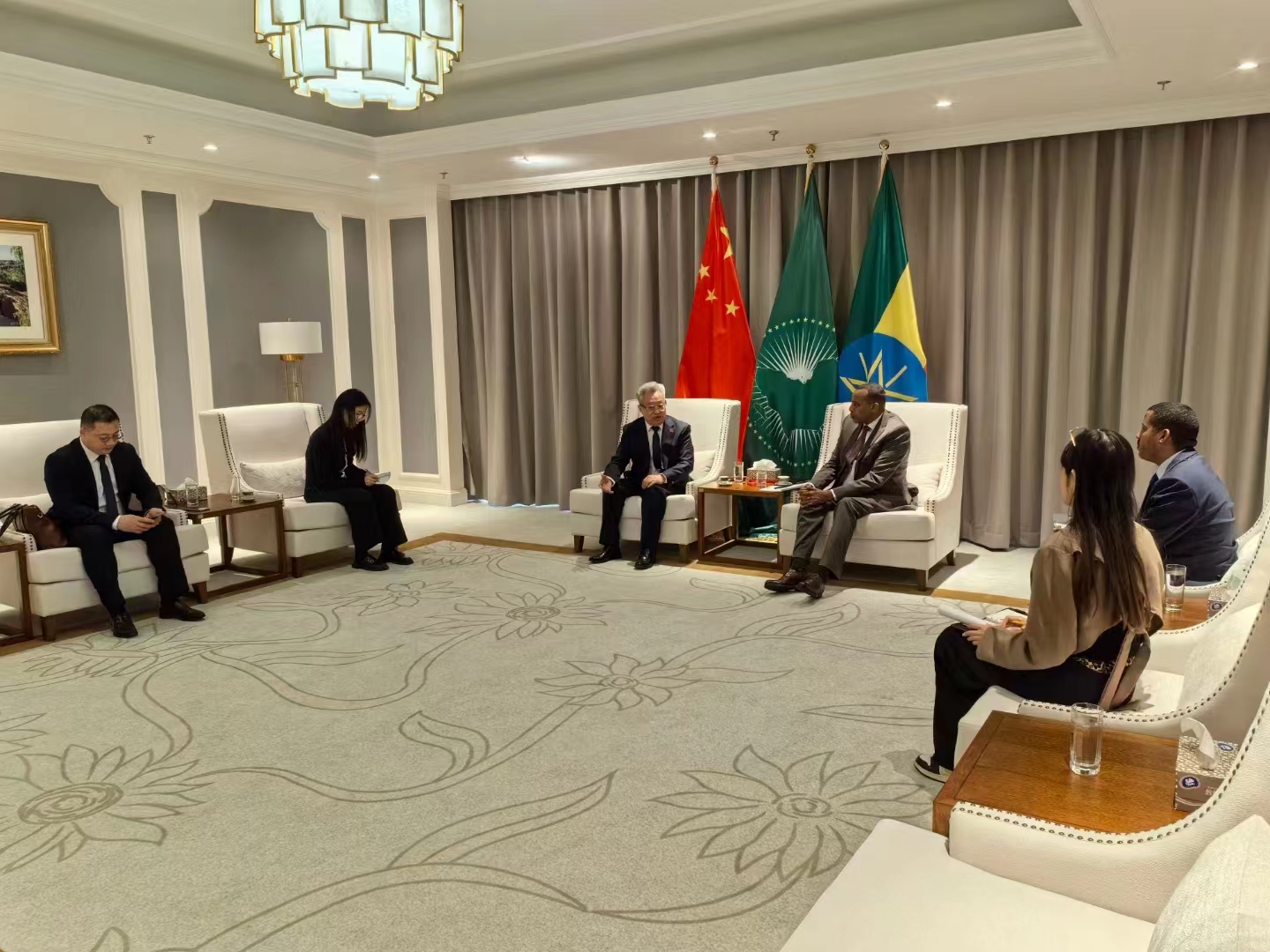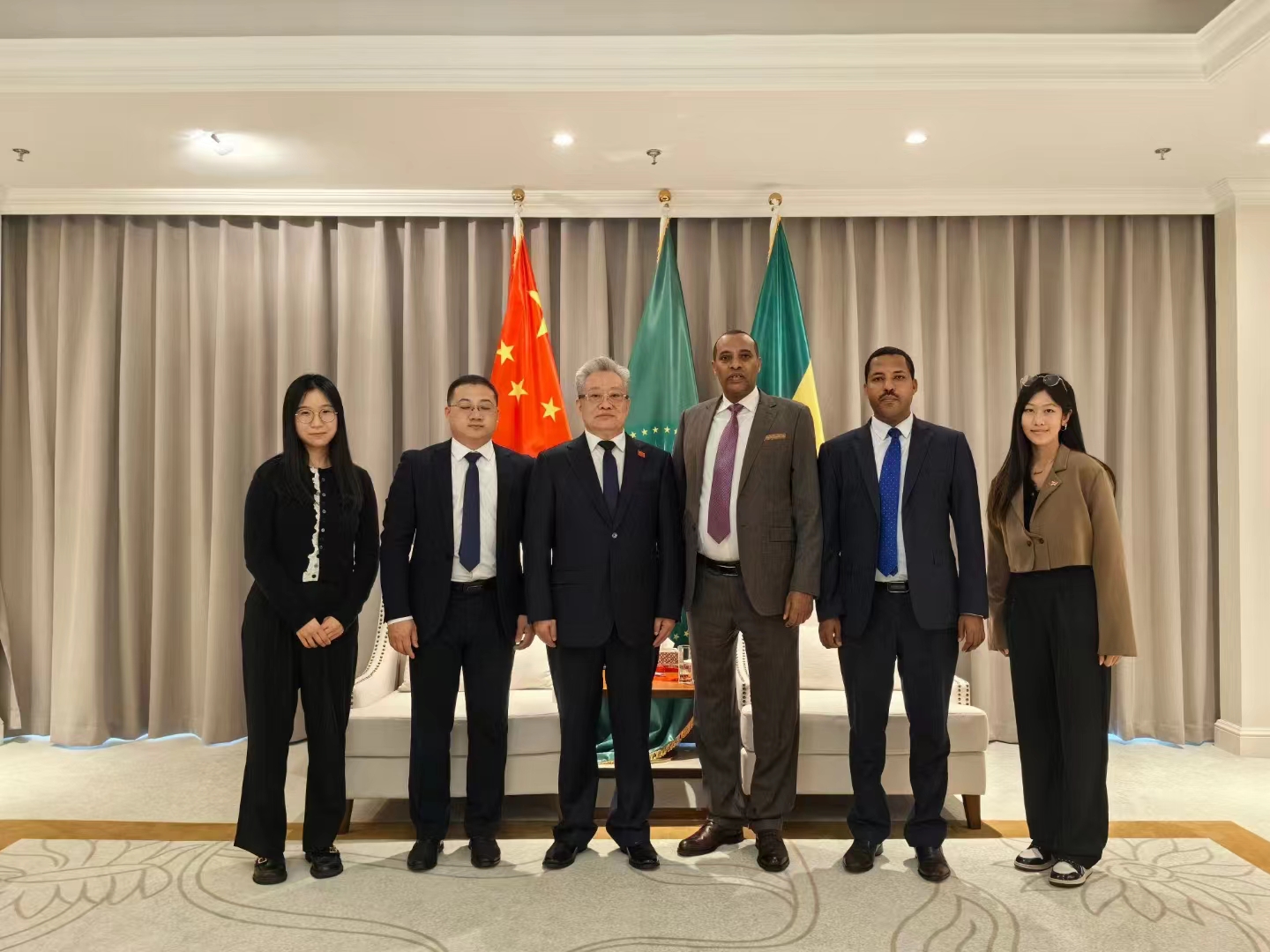 4月12日,中非经济贸易工作委员会在埃塞俄比亚驻华大使馆进行访前拜会。中非经济贸易工作委员会主任黄兆锦、外联主任杨佩超等人与埃塞俄比亚驻华副大使德瓦诺(Dawano Kedir)、埃塞俄比亚驻华商务参赞索罗门(Solomon Mekonnen Lelamo)共同出席会见。